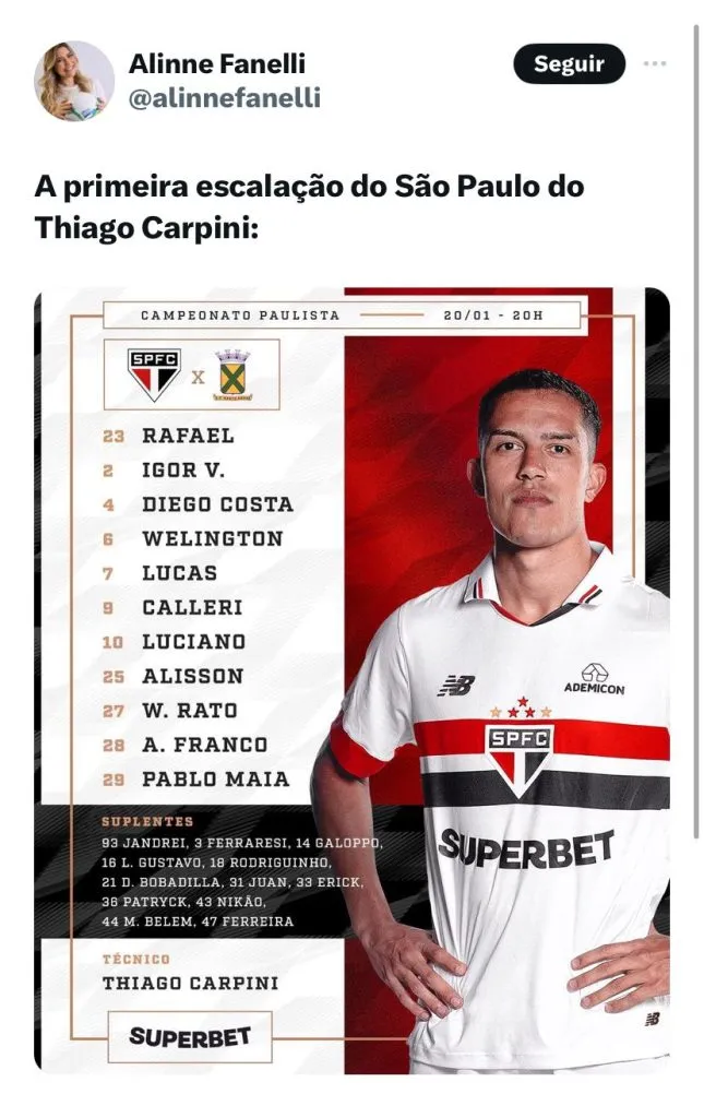 Além de Arboleda, James não retornou ao CT para se representar com o elenco. Essa será a terceira competição do ano para o Tricolor Paulista, que também jogou a Supercopa do Brasil e como dito acima o Paulistão, somando no total 14 jogos na temporada atual.