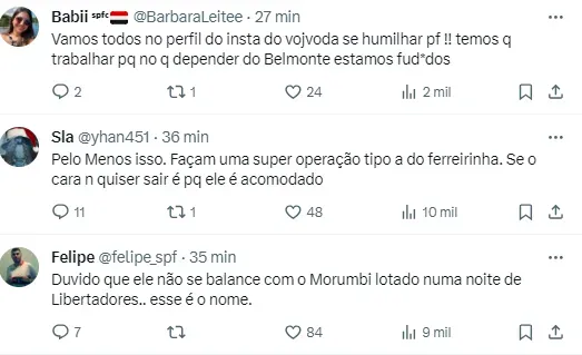 “Informação que acabo de receber: Juan Pablo Vojvoda é o Plano A do São Paulo com a iminente saída de Dorival Júnior para a Seleção Brasileira. O São Paulo vai apresentar um extenso projeto ao treinador e está disposto a pagar a multa do Fortaleza”, iniciou em seu perfil no Twitter.
