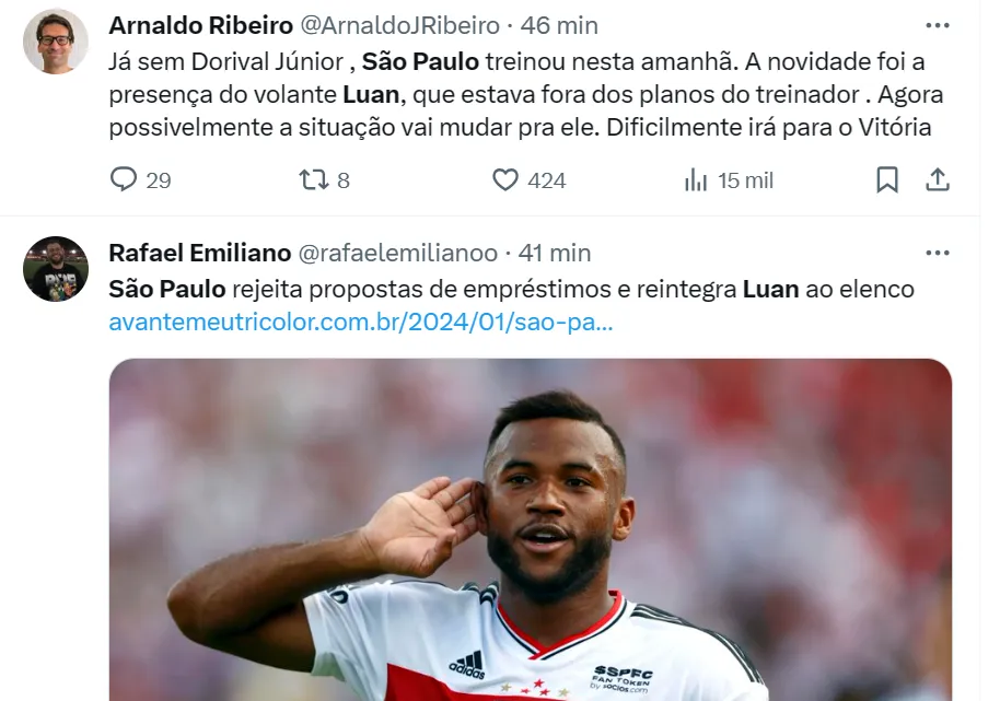 Luan tem contrato no São Paulo até dezembro de 2026. De acordo com a apuração de Emiliano, o plano do Tricolor é vender o volante em definitivo, seja nesta janela ou na próxima.