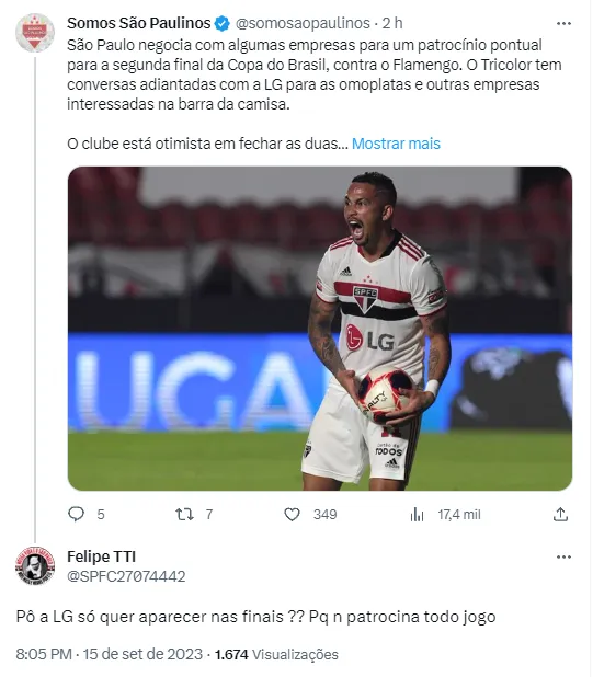 Após reportagem do Uol atualizar algo que o Bolavip Brasil já havia noticiado, um interesse da LG em patrocinar o São Paulo de forma pontual na decisão da Copa do Brasil, os tricolores reclamaram. A marca de eletrônicos tem uma longa história com o Clube, o que dá mais liberdade para críticas populares. Na visão de muitos são-paulinos, a companhia não deveria patrocinar a equipe apenas na final, mas em todo o restante da temporada.
