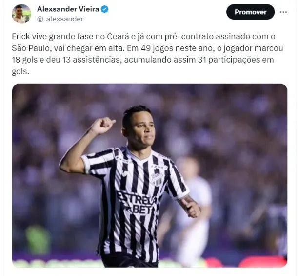 Ao todo, a reportagem apurou que o clube estuda contratar mais três jogadores para 2024. Um dos reforços já garantidos para a próxima temporada é o atacante Erick, do Ceará. Ele vive grande fase no Ceará e já com pré-contrato assinado com o São Paulo, vai chegar em alta. Em 49 jogos neste ano, o jogador marcou 18 gols e deu 13 assistências, acumulando assim 31 participações em gols.