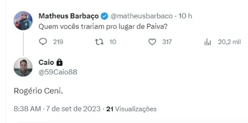 Dessa forma, aos serem questionados sobre um substituto ideal e imediato, os torcedores baianos estão pedindo a chegada de Rogério Ceni, que está desempregado desde que saiu do Tricolor há alguns meses. Ainda não há movimentações, mas pela quantidade de postagens vistas, caso a diretoria opte pela contratação, vai ocorrer uma invasão no aeroporto de Salvador.