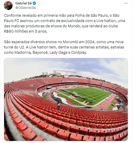 “Conforme revelado em primeira mão pela Folha de São Paulo, o São Paulo FC assinou um contrato de exclusividade com a Live Nation, uma das maiores produtoras de shows do Mundo, que renderá ao clube R$ 60 milhões em 5 anos”, relatou o jornalista.