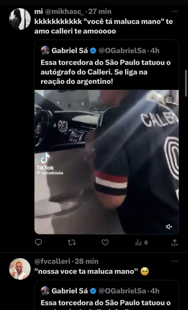 Em vídeo postado no TikTok, mas que viralizou no Twitter, o jogador é abordado pela torcedora Cintia Bruna, ela vai até o carro e fala: “Calleri, você lembra quando eu pedi para você autografar na minha mão?”, disse a torcedora, mostrando que no lugar que o camisa 9 assinou, ela tatuou. Calleri sorriu e falou: “Nossa, você está maluca mano”, disse. A torcedora justificou que ela é maluca pelo São Paulo e por tudo que o argentino está fazendo com a camisa Tricolor, ele agradeceu e o vídeo terminou com um abraço. Na web, os torcedores reagiram ao momento de Calleri ao ser pego de surpresa.