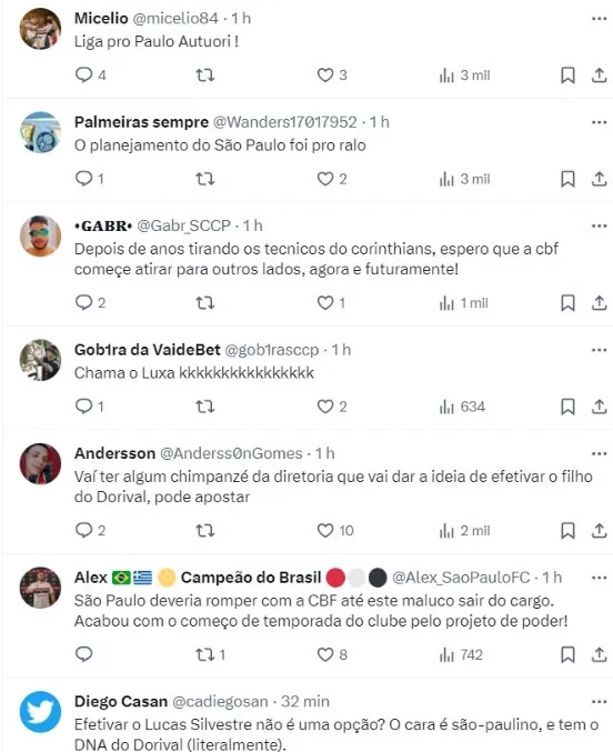 “Lucas Silvestre vai comandar treinos do São Paulo durante a pré-temporada e enquanto a diretoria busca um novo comandante. O profissional faz parte da comissão de Dorival Júnior e irá acompanhar o treinador na seleção brasileira. Depois que São Paulo contratar o novo técnico, Lucas Silvestre deixa o cargo”.