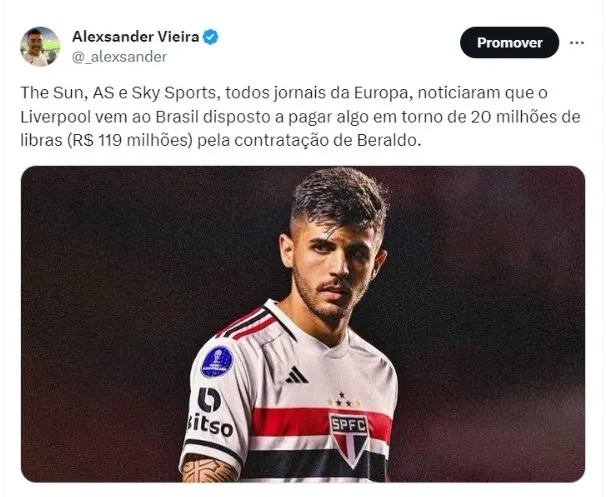 “Representantes do Liverpool voaram para o Brasil em busca de fechar um acordo de 20 milhões de libras por Beraldo”, escreveu o portal AS.