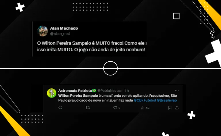 “O Wilton Pereira Sampaio é muito fraco! Como ele ama picotar jogo, isso irrita muito. O jogo não anda de jeito nenhum!”. “Wilton Pereira Sampaio tá no meu top 3 de piores árbitros“, criticaram outros são-paulinos.