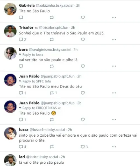 Dessa forma, vários comentários como “Sonhei que o Tite treinava o São Paulo em 2025”, por exemplo, foram vistos, comprovando que o ex-comandante da Seleção Brasileira, na opinião de inúmeros, poderia ser a melhor escolha.