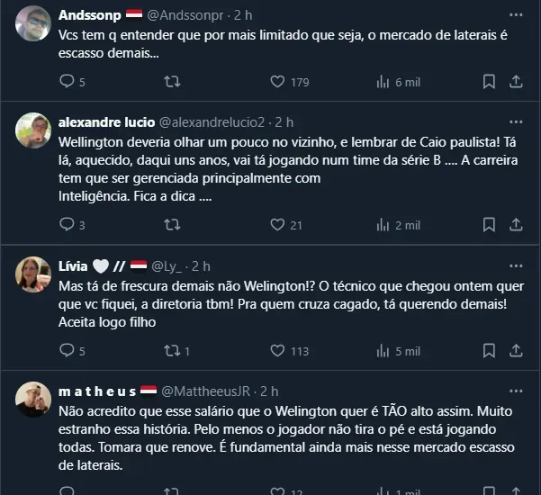 Dito isso, de acordo com informações do jornalista Eder Traskini, do UOL, o técnico Luis Zubeldía ainda pretende contar com Welington e teve uma reunião com o lateral nos últimos dias para entender a situação e tentar convencer o atleta a renovar, algo que a torcida criticou bastante.