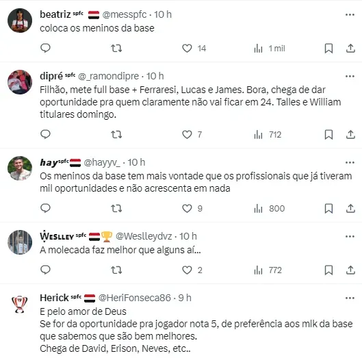 “Full base + Ferraresi, Lucas e James. Bora, chega de dar oportunidade pra quem claramente não vai ficar em 24. Talles e William titulares domingo”, pediu um torcedor. “Beleza, mas da oportunidade pra Cotia, chega de dvd e Erison. É James + 10 Cotia”, ressaltou outro.