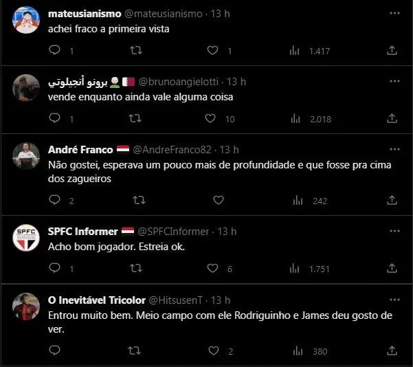 Ao todo, o camisa 47 esteve em campo por cerca de 19 minutos, tendo dado 12 passes certos, um drible certo e recuperado uma vez a posse da bola. O jovem de 21 anos foi bastante participativo e recebeu muitos elogios dos torcedores nas redes sociais. Inclusive, até mesmo uma comparação com Alexandre Pato foi feita, já que o ex-Milan (ITA) pouco tem atuado em 2023. Confira alguns comentários sobre a estreia de Pedrinho: