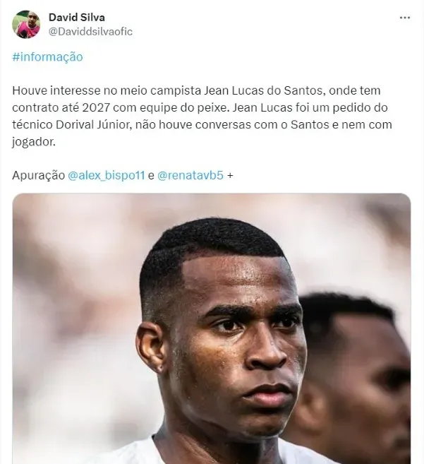 O comunicador informou que ainda não existe proposta oficial, mas um interesse: “Houve interesse no meio campista Jean Lucas do Santos, onde tem contrato até 2027 com equipe do peixe. Jean Lucas foi um pedido do técnico Dorival Júnior, não houve conversas com o Santos e nem com jogador”, escreveu.