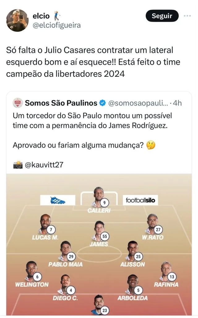 De acordo com o portal Ge, o São Paulo ainda quer neste mercado mais três reforços para seu elenco, porém, Júlio Casares e os demais diretores do Soberano estão pessimistas. Isso porque não há grandes nomes disponíveis nesta janela.