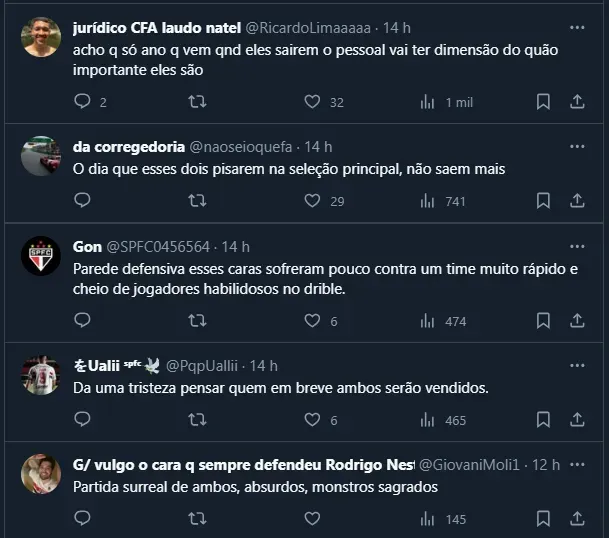Já Beraldo acertou 55 passes durante o jogo e foi o líder do time. Ademais, também não foi driblado uma vez sequer e não cometeu nenhuma falta. Até por isso, como ambos foram convocados para a Seleção Olímpica, alguns são-paulinos brincaram na web que a dupla cabe na Seleção de Fernando Diniz.