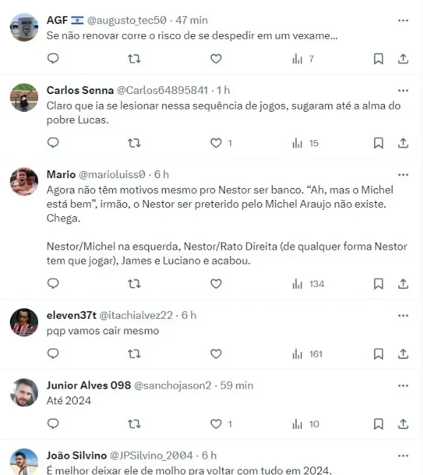 Dorival Júnior pretende utilizar jovens atletas e quem teve poucos minutos em 2023 na reta final da temporada. Como o ano letivo do futebol tem somente mais 40 dias, sendo bem possível que Lucas não vista mais a camisa do São Paulo esse ano, e isso pode ser o fim de sua segunda passagem caso ele não renove.