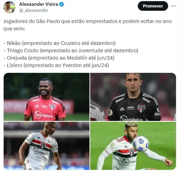 Em entrevista ao canal Arnaldo e Tironi, Calos Belmonte falo que o ex-camisa 10 do São Paulo, Nikão, deve voltar ao elenco tricolor e ser utilizado pelo técnico Dorival Júnior, que já trabalhou com o atleta e gosta do jogador. Em 2023, Nikão está emprestado ao Cruzeiro: “A comissão técnica inteira gosta do Nikão. Ele volta em janeiro. Dorival vai analisar, conversar com o próprio Nikão, que tem contrato com a gente, e vai dizer. Se o Dorival quiser, vamos deixar o Nikão aqui”.