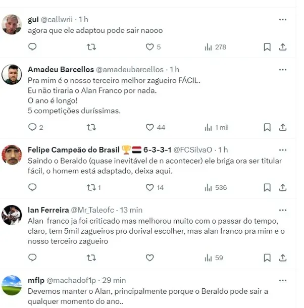 Enquanto isso, diversos outros atletas começam a receber sondagens do futebol do exterior e um deles é Alan Franco, que chegou nesta temporada para complementar o elenco tricolor. Alguns jogadores também estão de saída.