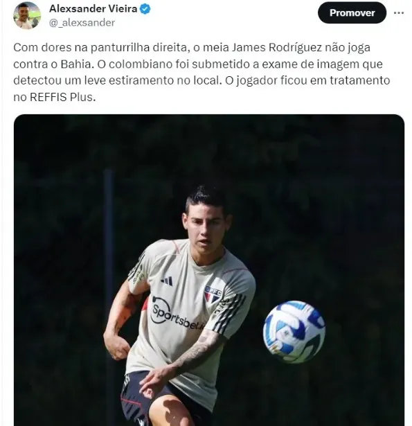 Com dores na panturrilha direita, o meia James Rodríguez foi submetido a exame de imagem que detectou um leve estiramento no local.