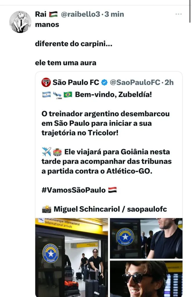 Na manhã deste domingo (21), o novo treinador do São Paulo, Luis Zubeldía, desembarcou em solo brasileiro para assumir o comando do Tricolor. O argentino, que foi anunciado oficialmente pelo clube no último sábado (20), após a demissão de Thiago Carpini, chegou ao Aeroporto Internacional de Guarulhos e concedeu entrevista coletiva.