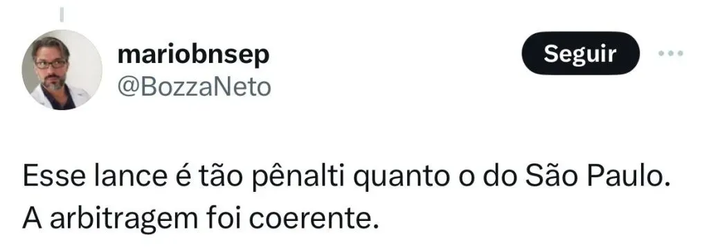 “Enquanto o juiz via se daria pênalti ou não. E aí expulsam quem? Quem? Um membro do São Paulo. O Stefano Djian. Eu sei que é o Stefano Djian que é o filho do Marcelo Djian. Então quer dizer que o cara xingou o tempo inteiro ele por causa do pênalti certo, aí ele serve para tomar uma atitude forte. Vem cá. Tá expulso”.