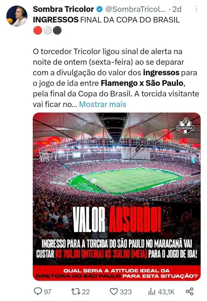 O presidente do São Paulo, Julio Casares, criticou os valores cobrados pelo Flamengo para o setor visitante, a entradas é de cerca de R$ 700. Ele afirmou que tomou conhecimento dos preços através da imprensa e prometeu reciprocidade no duelo decisivo que acontece no Morumbi. “Eu não recebi nada oficialmente. Vi pela mídia que os ingressos para o setor visitante serão de R$ 700, com uma meia de R$ 350. Nós vamos ter a reciprocidade. O preço praticado lá será praticado aqui também para os visitantes”, disse Casares à ESPN.
