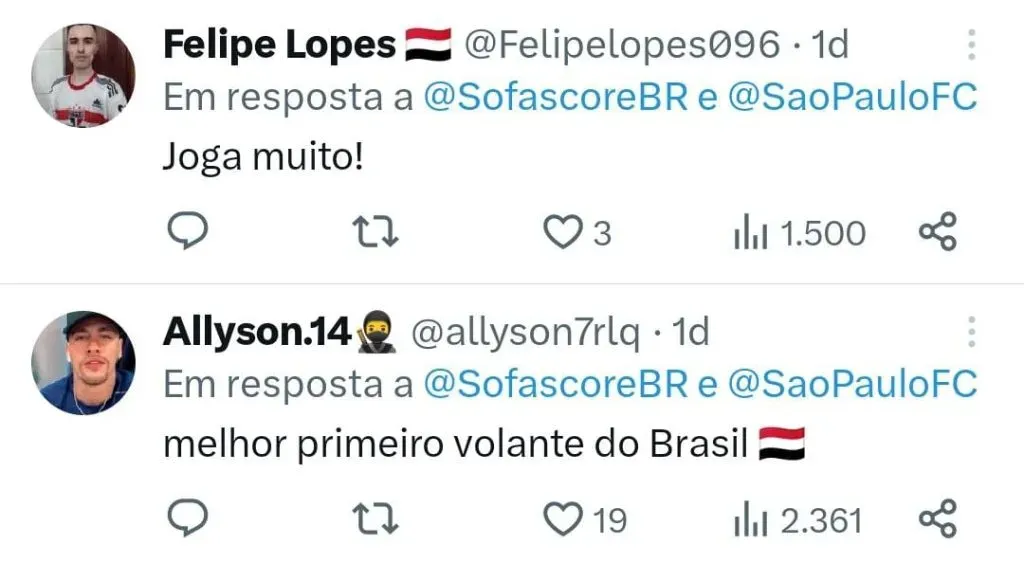 “Quando falei que esse mlk era um joia me jogaram aos leões (inclusive São Paulino 😷)”, contou um internauta. Além dele, outro torcedor tricolor afirmou que o volante deveria ser mais valorizado. “Um dos grandes subestimados desse país”. “Pouca mídia e muito futebol. Volante completo. Craque”, disparou outro.