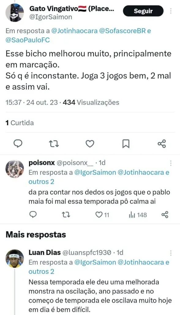 Houve também torcedor que destacou o processo de evolução vivido por Pablo Maia. “O Pablo Maia é o volante que mais evolui no futebol br, não digo q ele é o melhor mas para quem vê aquele mlk cru bagre de 2 anos atrás na base quase descartado, pro jogador q ele é hj não tem nem comparação, ele já passou mt do teto de potencial dele e não para de evoluir”, avaliou.