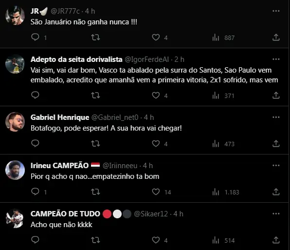O último triunfo tricolor no estádio do rival aconteceu em 2012, há cerca de 11 anos. Inclusive, o retrospecto geral entre as equipes é bem equilibrado, com 46 vitórias dos paulistas, 43 dos cariocas e outros 36 empates. Até por isso, o torcedor do SPFC está dividido para a partida, visto que a equipe é uma das duas únicas que não venceu como visitante na atual edição. Confira alguns comentários de torcedores sobre a possibilidade de vencer o Vasco: