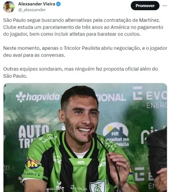O São Paulo tenta viabilizar a possibilidade de contratar Martínez e busca alternativa. O América é dono de 50% dos direitos do jogador e pagou R$ 6,2 milhões para tê-lo, ou seja, o Tricolor teria que desembolsar uma quantia maior.