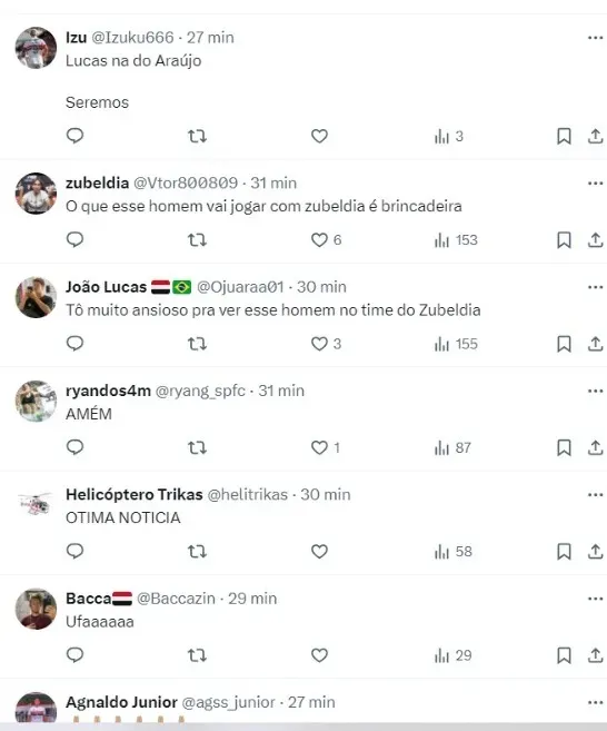 “Lucas Moura estará à disposição do técnico Zubeldia para o jogo contra o Fluminense!“, escreveu o jornalista André Hernan em uma publicação em seu X, antigo Twitter.