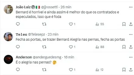 “O entendimento dos clubes que sondaram, é de que não tem necessidade de investir grana agora, visto que Jan/24 ele poderá assinar pré-contrato. Ao final do contrato, Bernard irá se reunir com seu empresário e ver as possibilidades. Inclusive, de permanecer na Europa”, acrescentou.