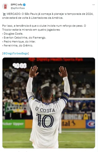 Com isso, de acordo com o jornalista Diego Torbes, informando que quatro atacantes estão sendo monitorados pelo São Paulo para 2024: Douglas Costa, Pedro Henrique, Ferreirinha e Everton Cebolinha.
