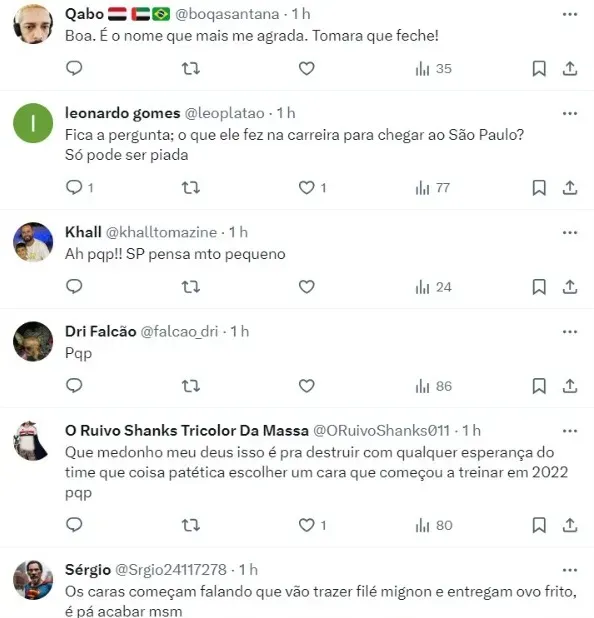 “Inclusive, prints de conversas foram mostradas para um dirigente da equipe de Caxias. O Tricolor paulista está no mercado em busca de um substituto para Dorival Júnior”, concluiu o jornalista.