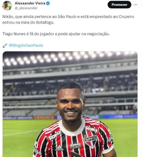 A pedido do técnico Tiago Nunes, Botafogo sinaliza interesse em Nikão para 2024. O jogador pertence ao São Paulo e está emprestado ao Cruzeiro.