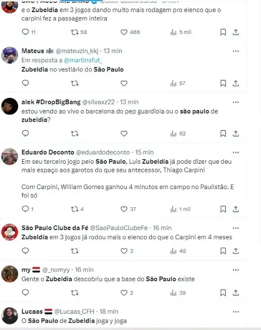 “São Paulo tomou o gol o Zubeldia rapidamente já deu bronca em geral no campo e eles virou rapidamente, a diferença de um treinador que fala com o time não fica agachado só olhando“, escreveu outro torcedor.