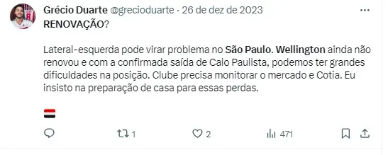 No entanto, a diretoria acabou recebendo uma notícia pra lá de amarga nos bastidores. Isso porque realizou uma proposta para renovar com o lateral-esquerdo Wellington, mas parece que nem tudo caminhou como esperado.