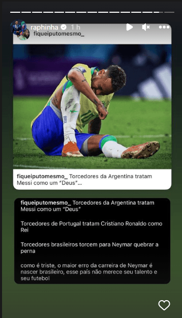 Parte da declaração pode ter sido motivada às críticas direcionadas ao atleta após Neymar deixar o campo. Alguns torcedores ‘descartaram’ a importância do atacante na Seleção, por conta de polêmicas em que o jogador se envolveu recentemente. Em suas redes sociais, o atacante Raphinha também se posicionou a respeito da situação e saiu em defesa do colega de equipe. Confira ostoriepostado noInstagramdo camisa 11.
