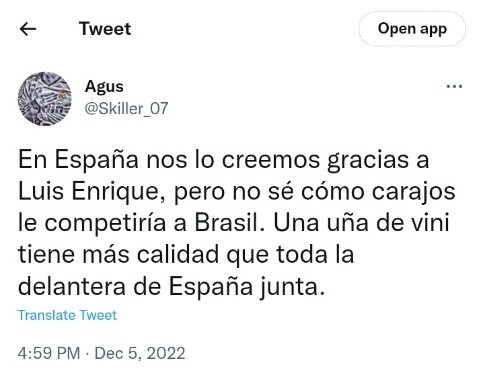 Veja algumas reações: “Na Espanha acreditamos graças ao Luis Enrique, mas não sei como diabos ele iria competir contra o Brasil. Uma unha de Vini tem mais qualidade do que todo o ataque da Espanha junto”, escreveu um torcedor nas redes sociais. Outro, foi direto ao ponto: “Luis Enrique preferiu perder para o Japão a ser humilhado para o Brasil. Não vejo Busquets, Pedri e Gavi parando esse time”. A ironia também marcou os comentários: “O lance do Luis Enrique se deixar vencer para evitar o Brasil até a final são das três melhores jogadas da história do futebol”.