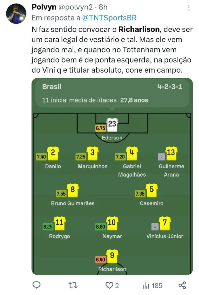 Mesmo diante das justificativas apresentadas pelo jogador, muitos seguem questionando a titularidade de Richarlison, já que a principal função do camisa 9 é fazer gols e Fernando Diniz explicou o motivo de o atleta do Tottenham ainda ser o titular e afirmou que a escolha pelo centroavante é técnica e justificou.