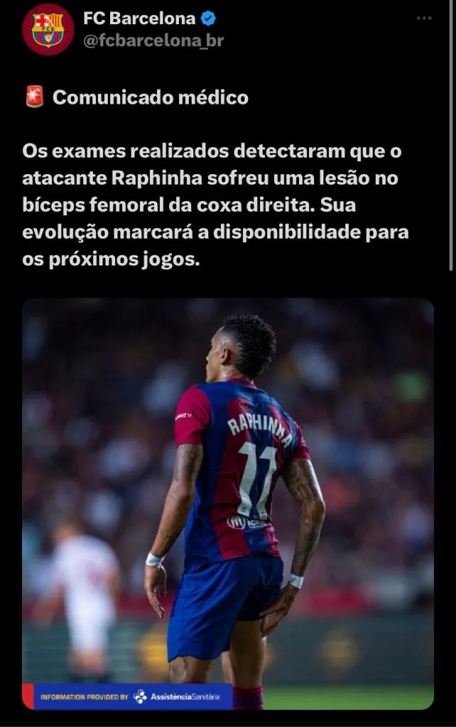 O atleta sentiu a lesão aos 33 minutos do primeiro tempo contra o Sevilla, diante disso, a imprensa espanhola dava como certo o desfalque por 1 mês do jogador. Contudo, o Barcelona espera tê-lo no clássico contra o Real Madrid, que ocorre no dia 28 de outubro. Lembrando que quando Raphinha foi convocado foi para suprir a ausência de Vinicius Junior.