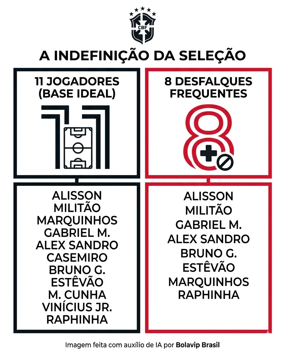 Mesmo com as dificuldades, já existe uma base na cabeça do treinador. Se todos estiverem disponíveis, o Brasil deve ter Alisson no gol; Militão, Marquinhos, Gabriel Magalhães e Alex Sandro na defesa; Casemiro e Bruno Guimarães no meio; e Estêvão, Matheus Cunha, Vinícius Jr. e Raphinha no ataque.
