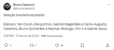 A Seleção Brasileira entra no gramado do Estádio Centenário de Montevidéu, nesta terça-feira (17), às 21h, para enfrentar o Uruguai. A partida a ser realizada é válida pela 4ª rodada das Eliminatórias Sul-Americanas da Copa do Mundo, em que a Amarelinha se encontra na vice-liderança após tropeçar contra a Venezuela. Passando por uma reformulação, sob o comando de Fernando Diniz, a Canarinho perdeu de cara um nome que poderia ser muito utilizado.