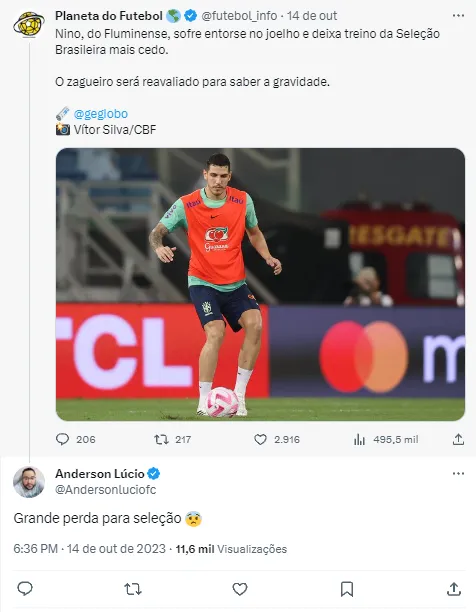 Líder no Fluminense e rosto ainda novo na Seleção Brasileira. Nino sofreu uma entorse no joelho ainda no último fim de semana e causou frustração em quem esperava ver ele vestindo a Amarelinha de forma profissional após a medalha de ouro nas Olimpíadas de Tóquio. Mas para acalmar um pouco os tricolores, o auxiliar-técnico Eduardo Barros admitiu, segundo o GE, que: “Não posso cravar, mas tenho a confiança que ele joga (a final da Libertadores)”.