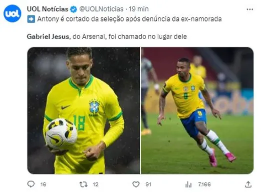 Contudo, além de dispensar o atacante do Manchester United, a CBF já apontou seu substituto: “Para a vaga de Antony, o técnico Fernando Diniz chamou Gabriel Jesus, que estava pré-selecionado em uma lista de 36 jogadores, enviada à FIFA”.