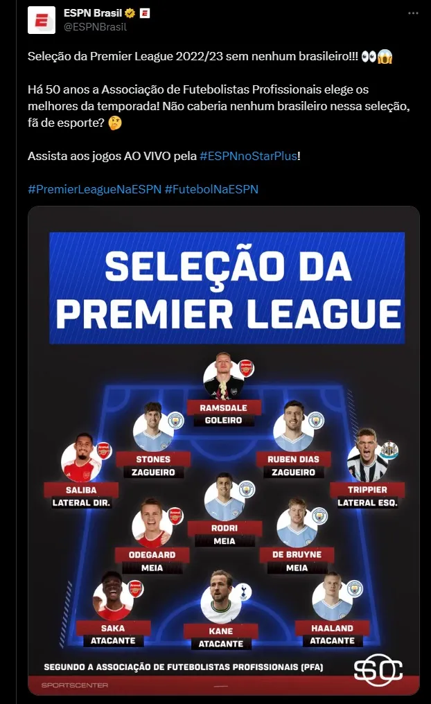 A Inglaterra divulgou nesta quarta-feira (30) a seleção da Premier League na temporada 2022-2023 e mesmo com vários brasileiros disputando a competição, nenhum deles está presente na lista, nem os convocados por Fernando Diniz para o início das eliminatórias em setembro.