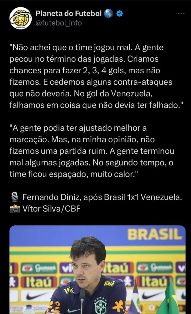 A Seleção Brasileira enfrentou a Venezuela na Arena Pantanal na noite da última quinta-feira (12). O Brasil ficou apenas no empate por 1 a 1 e viu a Argentina assumir a liderança das Eliminatórias para a Copa do Mundo de 2026. No primeiro tempo os brasileiros até tentaram abrir o placar, mas não teve muito sucesso, mesmo que tenham dito boas chances para marcarem.