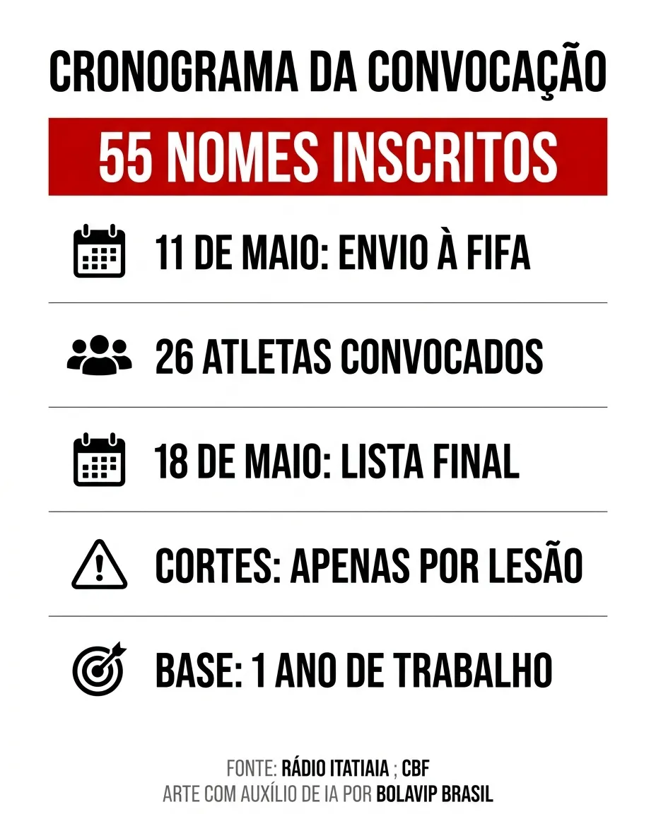 No dia 11 de maio enviaremos os 55 nomes inscritos à Fifa. Destes, sairão os 26 no dia 18. Depois disso, uma substituição só em caso de contusão comprovada, com exceção dos goleiros“, completou.