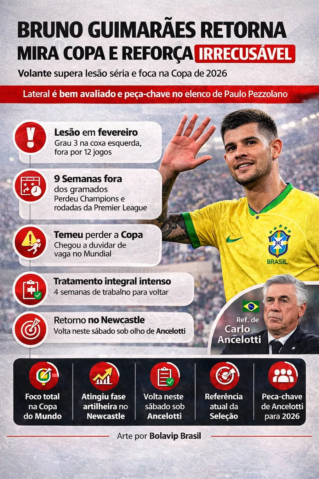 A experiência acumulada desde o último Mundial e a evolução técnica fazem Bruno se sentir mais preparado para assumir protagonismo na Seleção. Internamente, ele é visto como um dos pilares do time de Ancelotti.