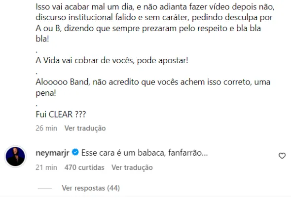 Fui Clear escreveu: “Isso vai acabar mal um dia, e não adianta fazer vídeo depois, discurso institucional falido e sem caráter, pedindo desculpa por A ou B, dizendo que sempre prezaram pelo respeito e blabla… A vida vai cobrar de vcs, pode apostar!” Contudo, Neymar comentou a postagem mostrando sua indignação com a fala pesada de Neto: “Esse cara é um babaca, fanfarrão…”, escreveu o camisa 10 da Seleção na postagem do comentarista esportivo.