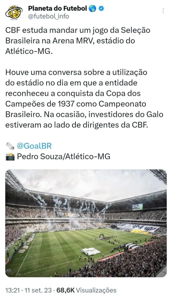 O Atlético-MG inaugurou seu estádio há cerca de duas semanas e a Arena MRV já recebeu jogos e shows, mas segundo informações do site GOAL, a casa do Galo pode também ser palco de ao menos uma partida da Seleção Brasileira. Segundo o portal, a CBF avalia mandar um dos jogos das Eliminatórias Sul-Americanas para a Copa do Mundo de 2026.